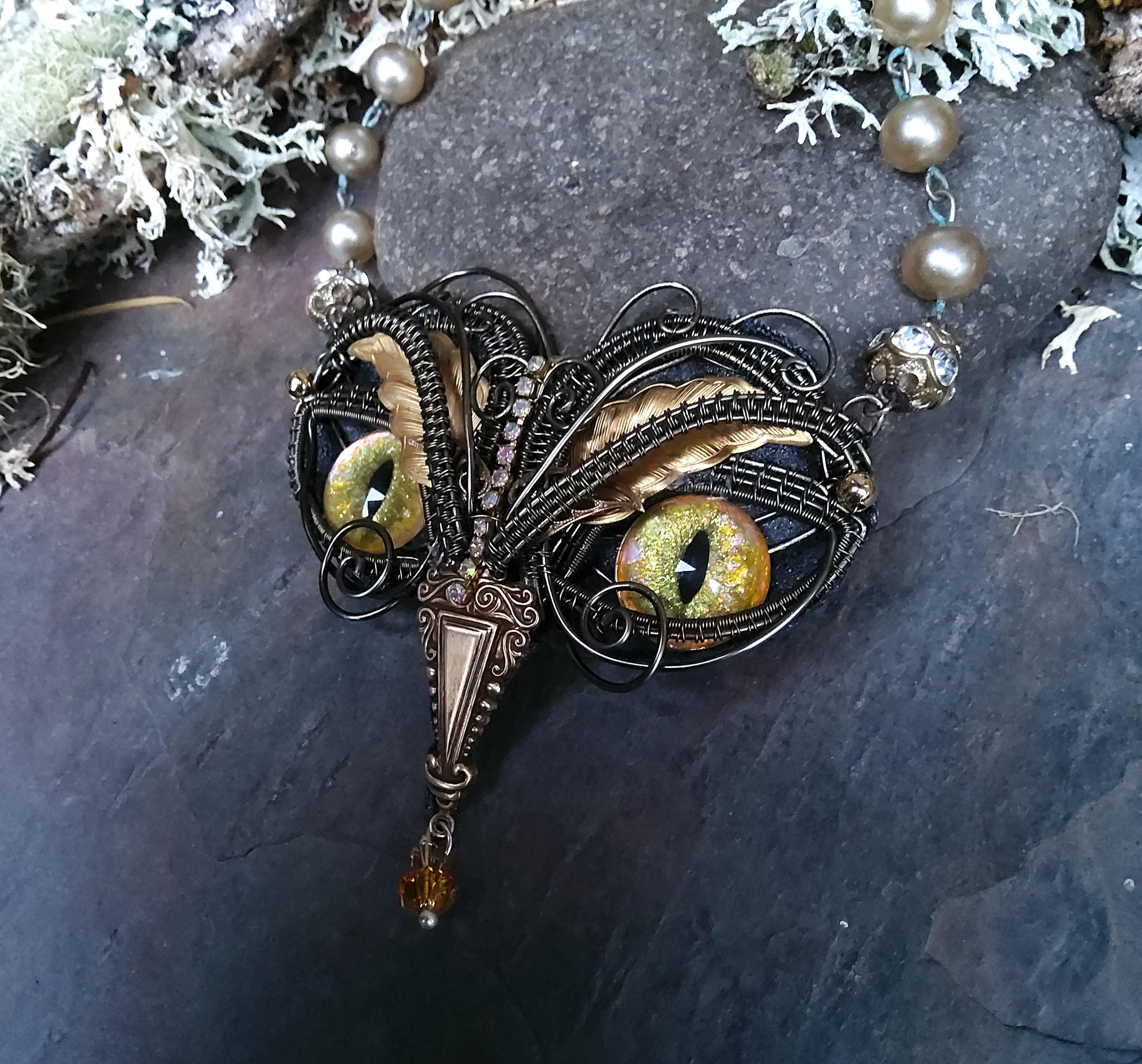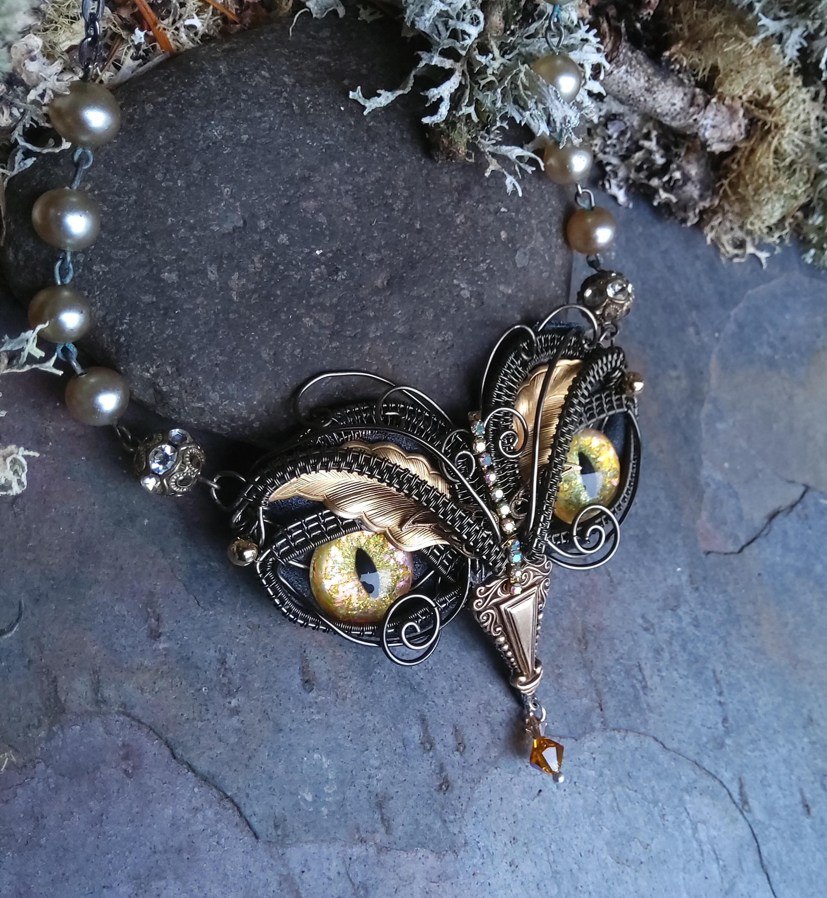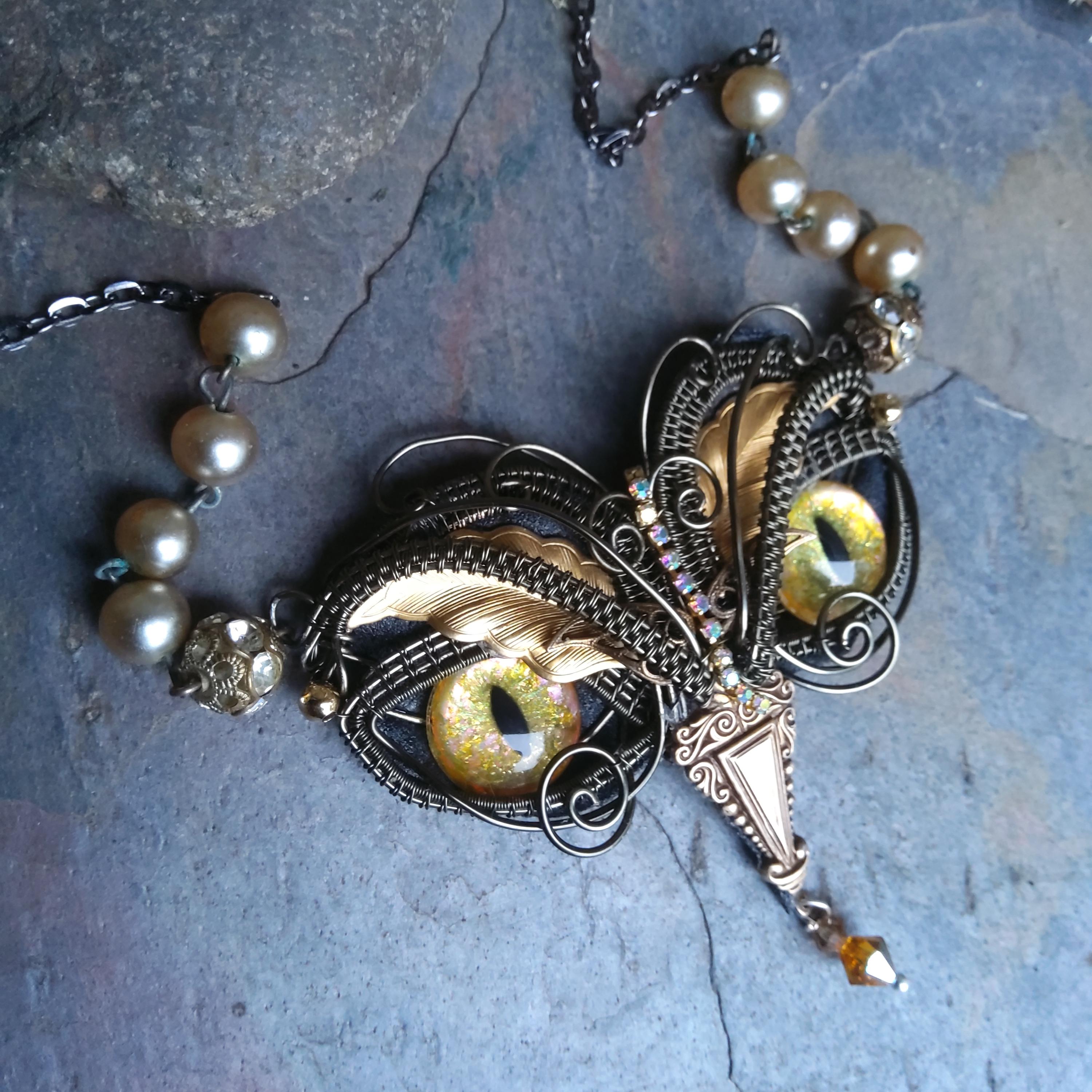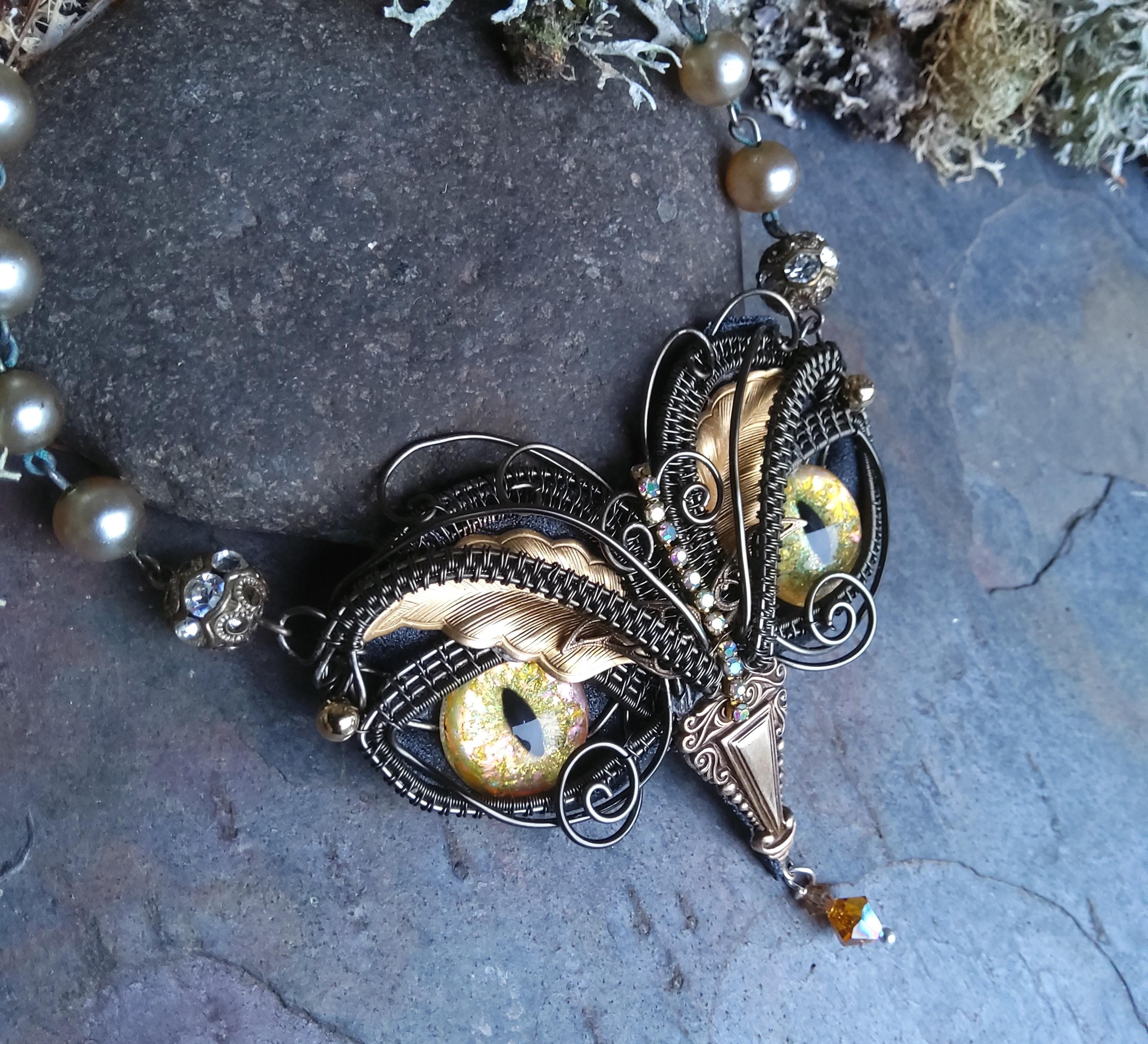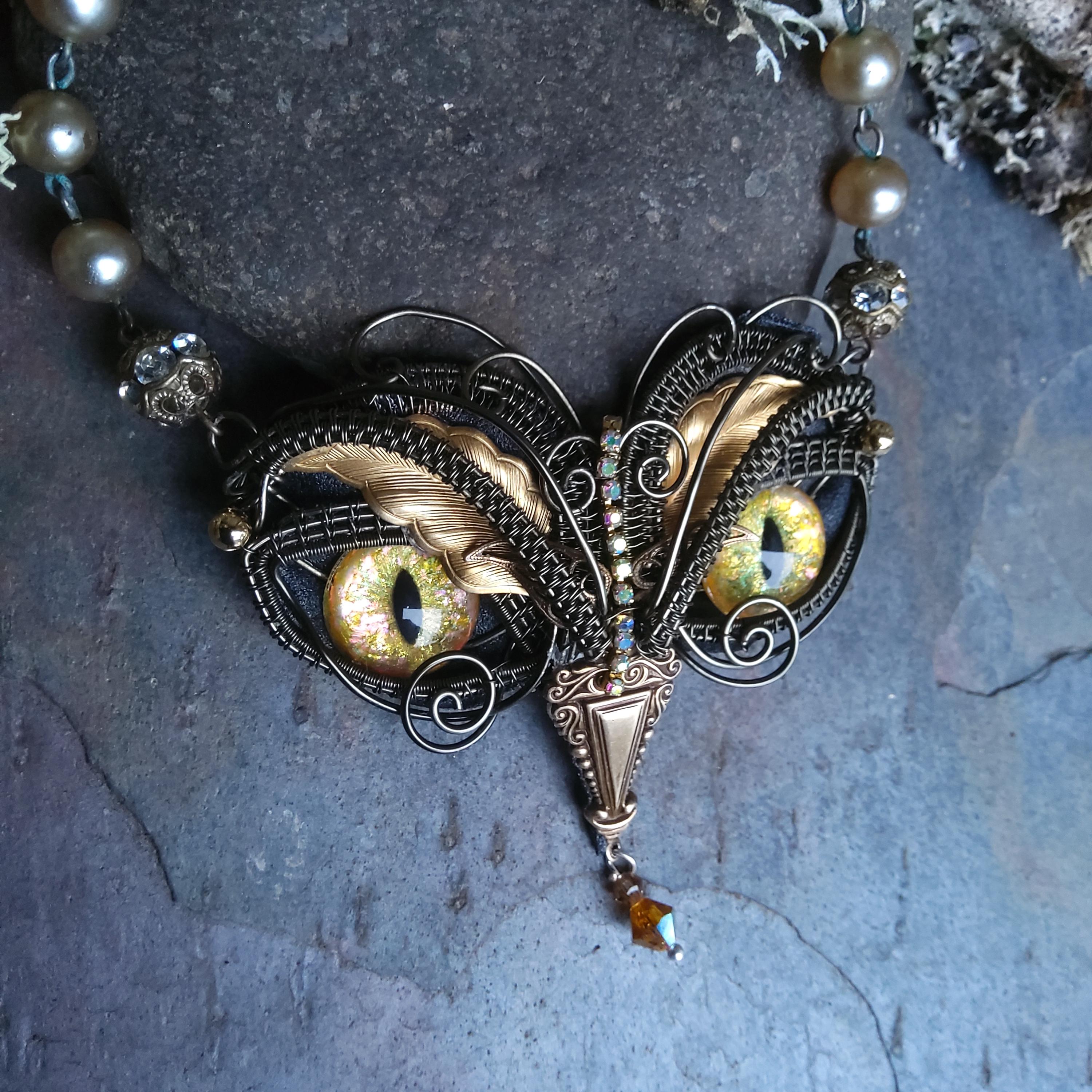 Back with one of my favorites, my owl eye necklace. This 3 inch wide piece is embellished with a section of vintage pearls and rhinestone balls I found at a market. A lovely piece that will be cherished.