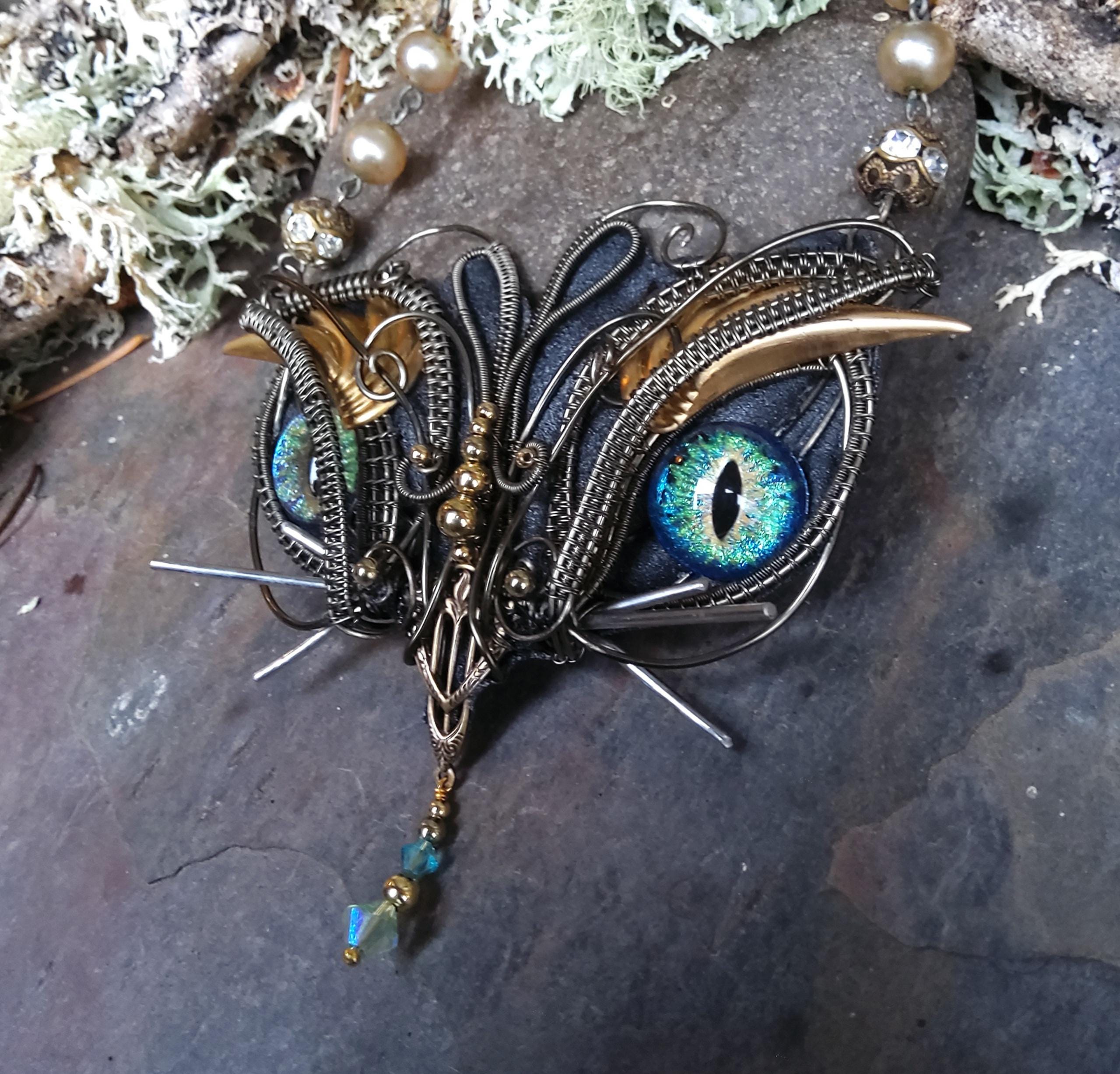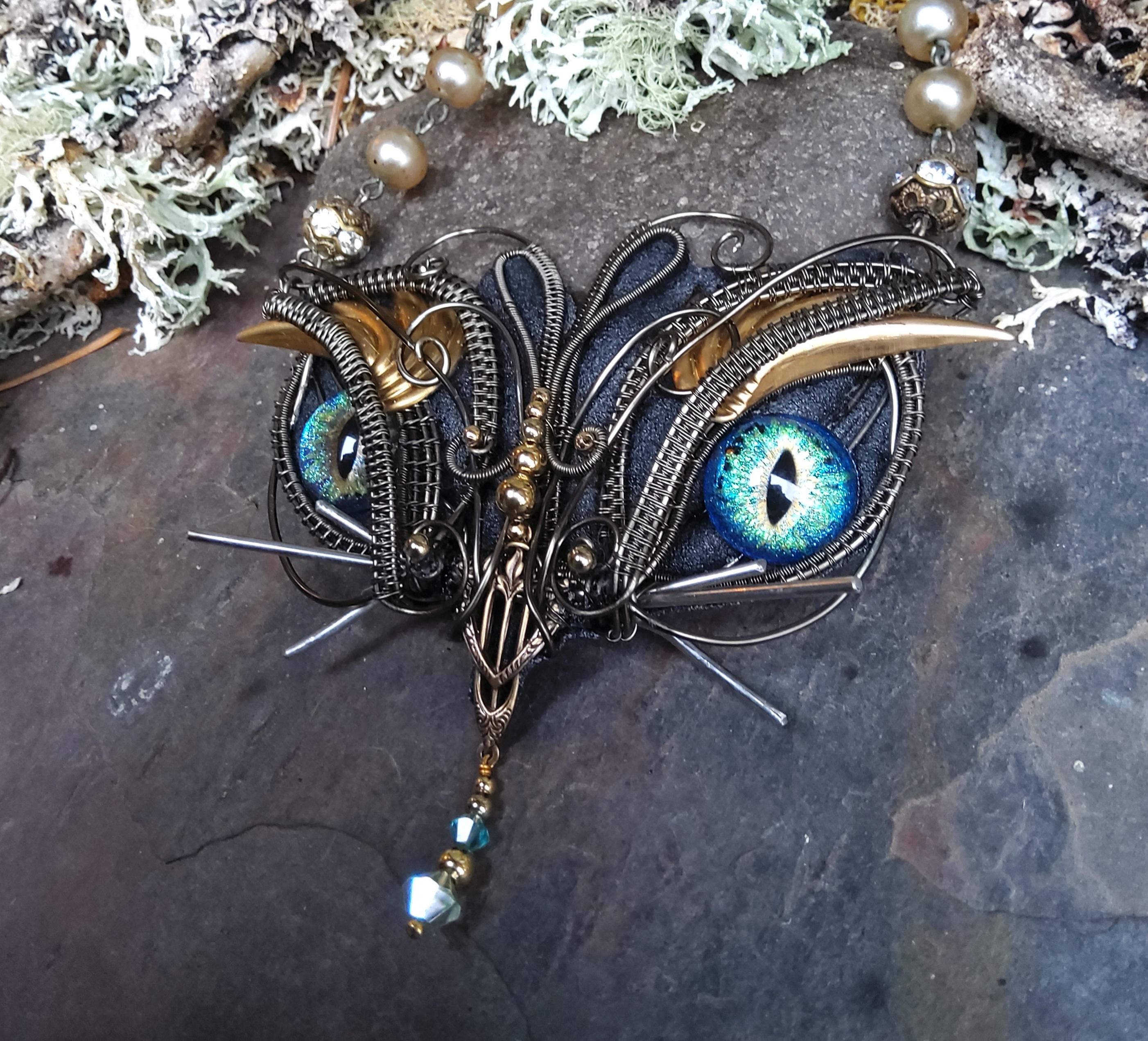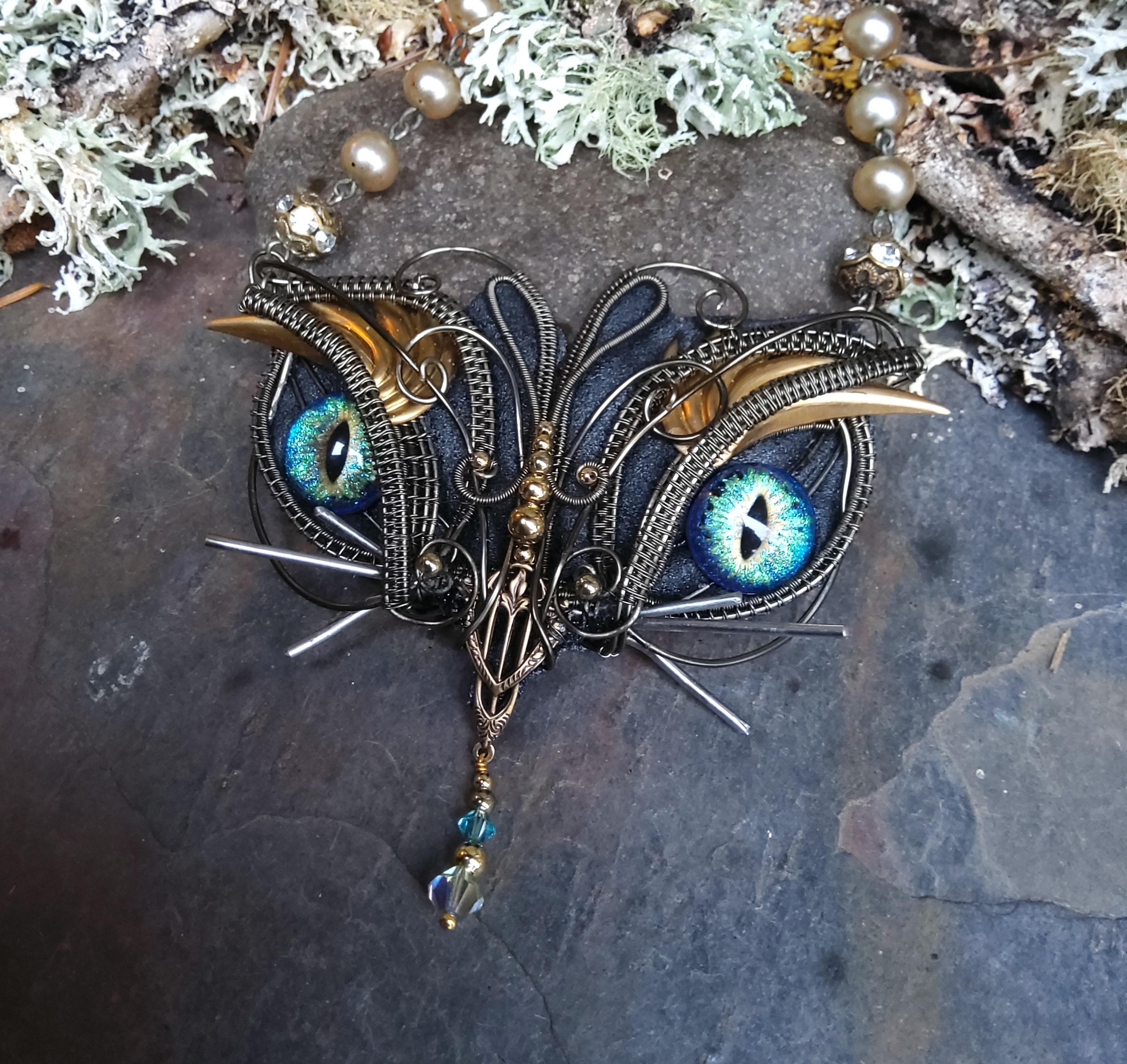Back with another statement piece. This four inch wide kitty has been handcrafted by me, creating a one of a kind necklace that will be a joy to wear.