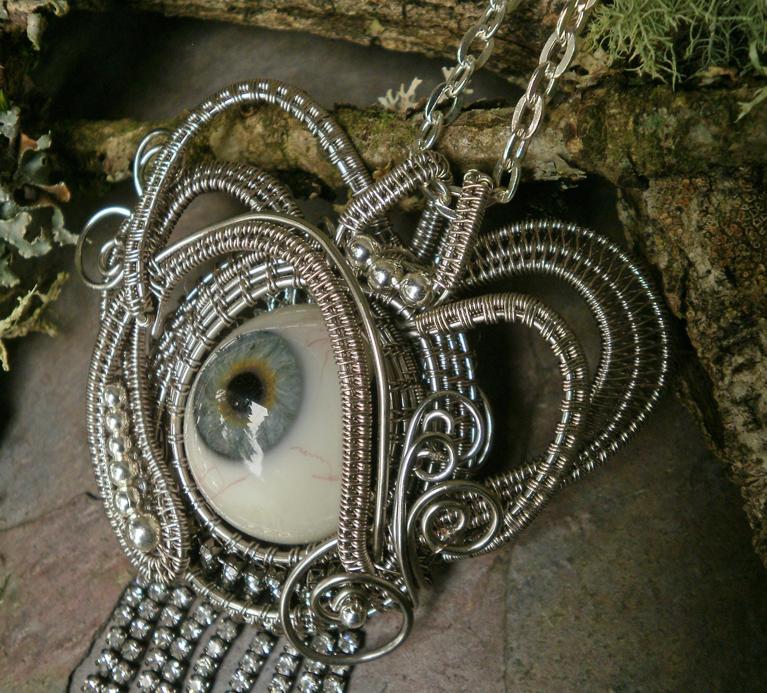 Such a beautiful shade of blue, this prosthetic eye is real, and is from the 1940's. Handwoven wire surround this lovely piece, and rhinestones and silver plated beads, embellish, creating a 3 1/2 inch long pendant. A statement piece that will be a joy to wear and show.
