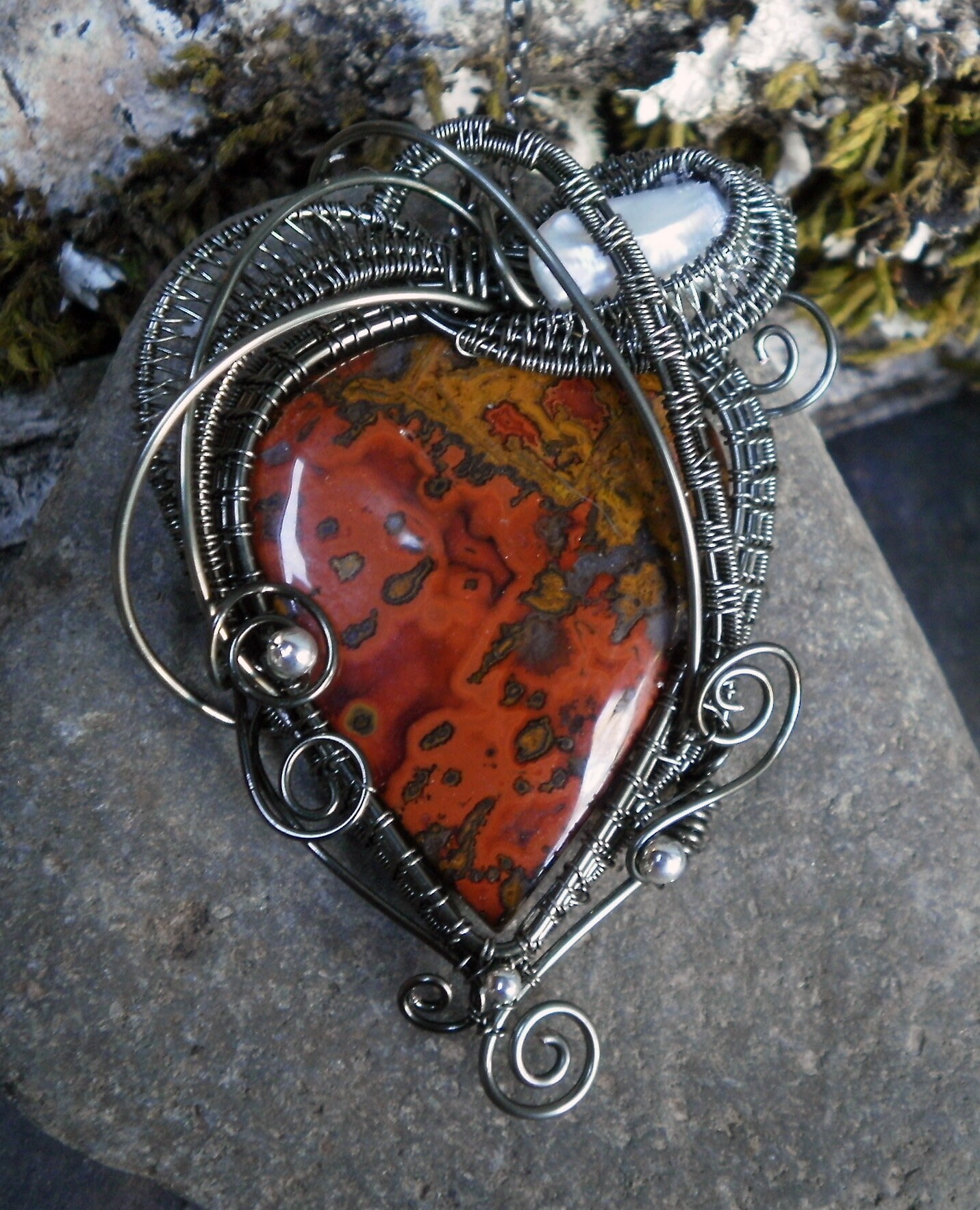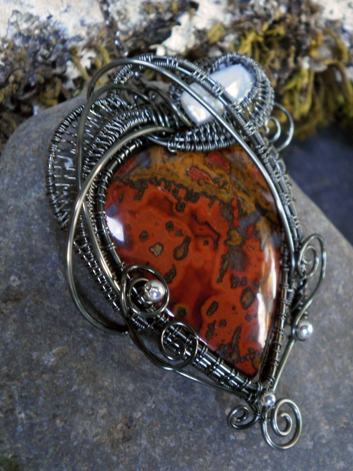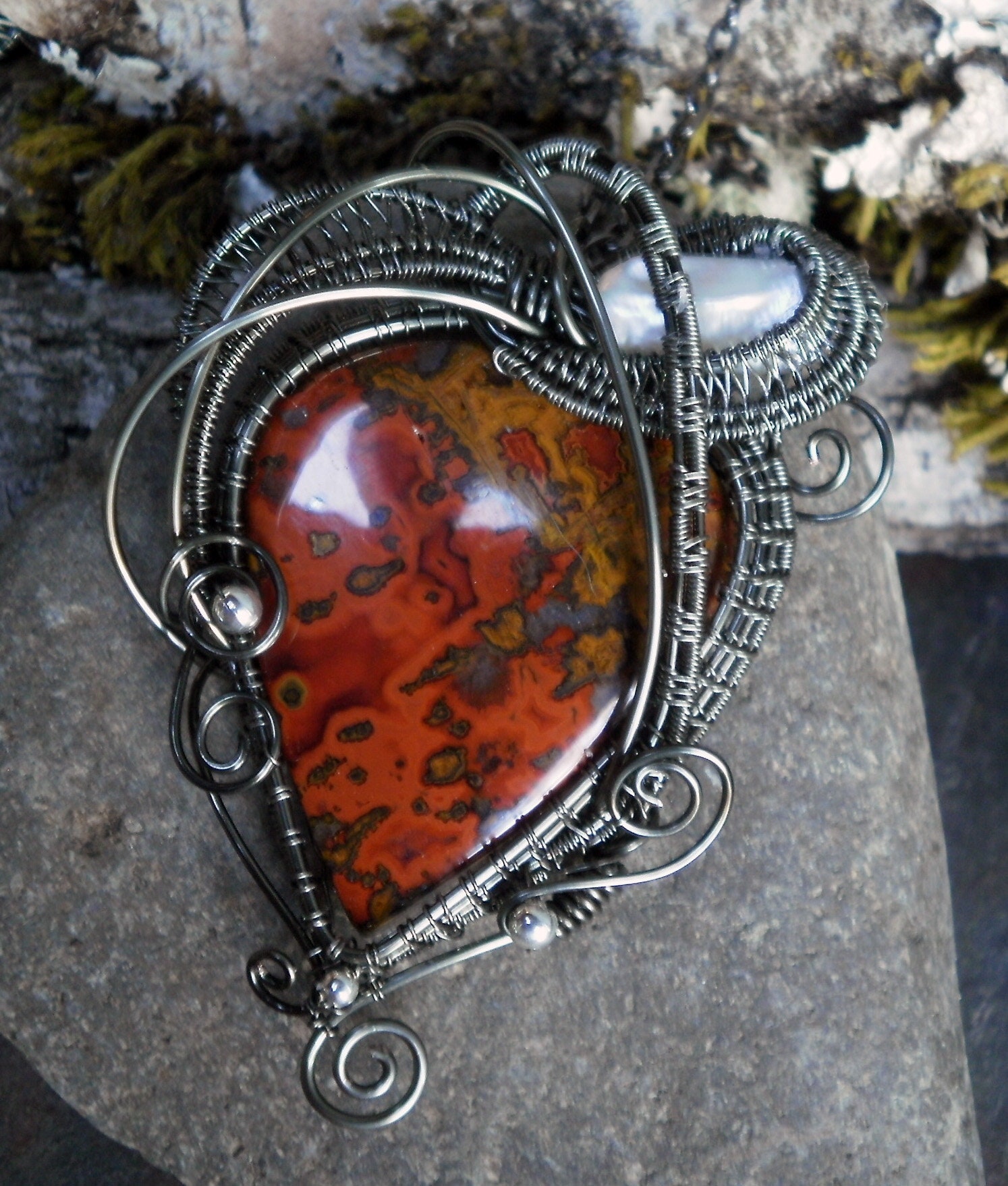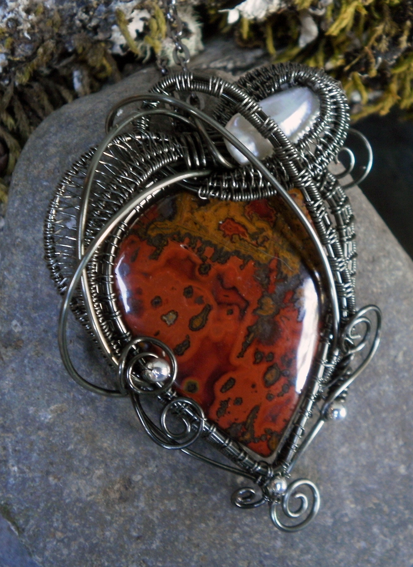 A new addition to the store, Moroccan Agate! Colors of Red, Rust, Orange, Brown and Black and just a touch of clear agate, make this one of a kind pendant a joy to behold. Tucked into the wire is a pearl, for added interest. A beautiful piece to see and wear.