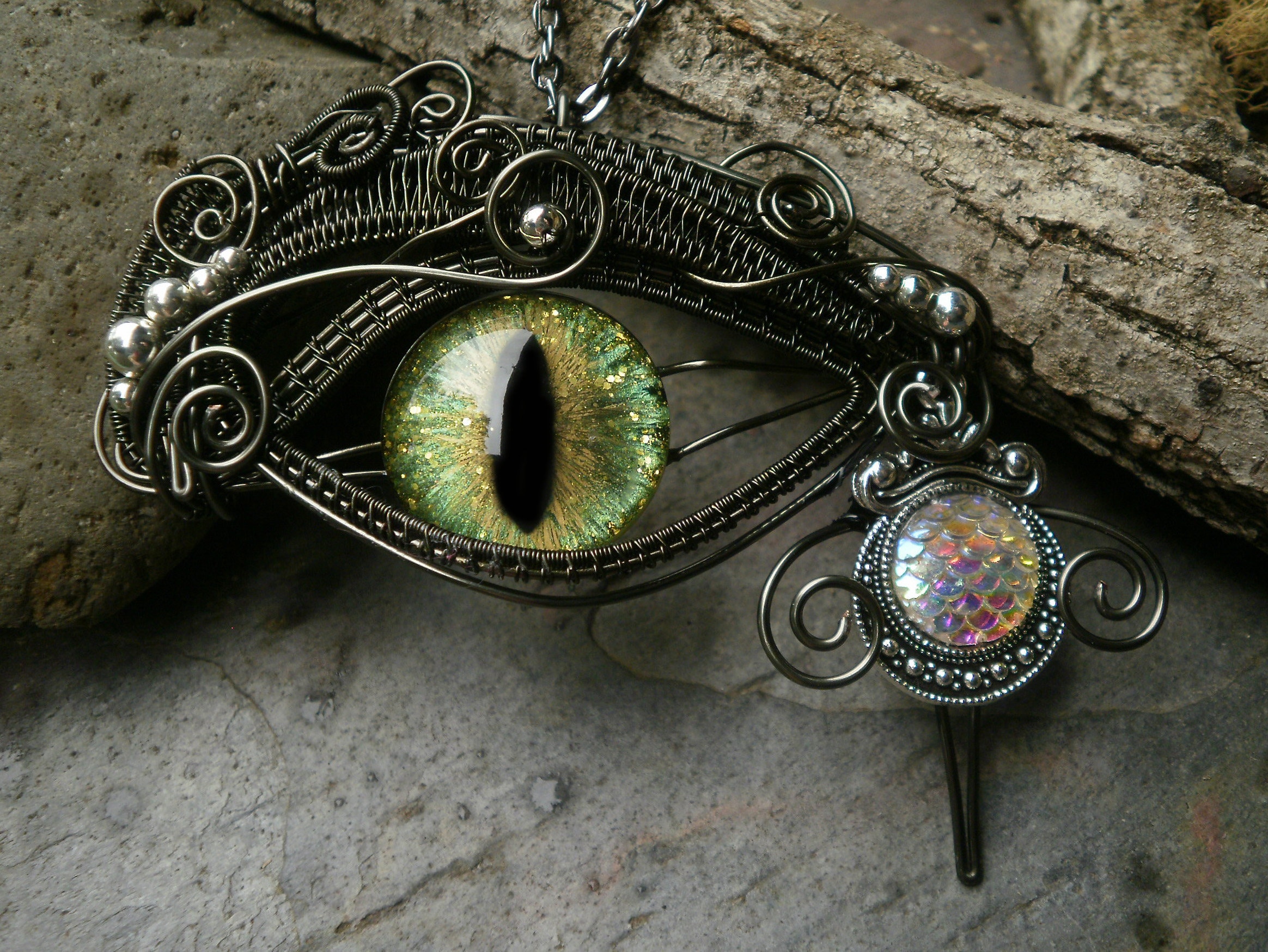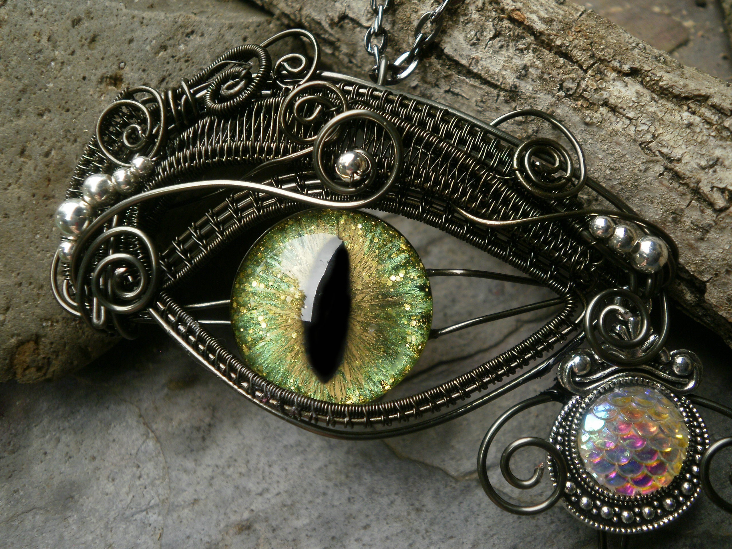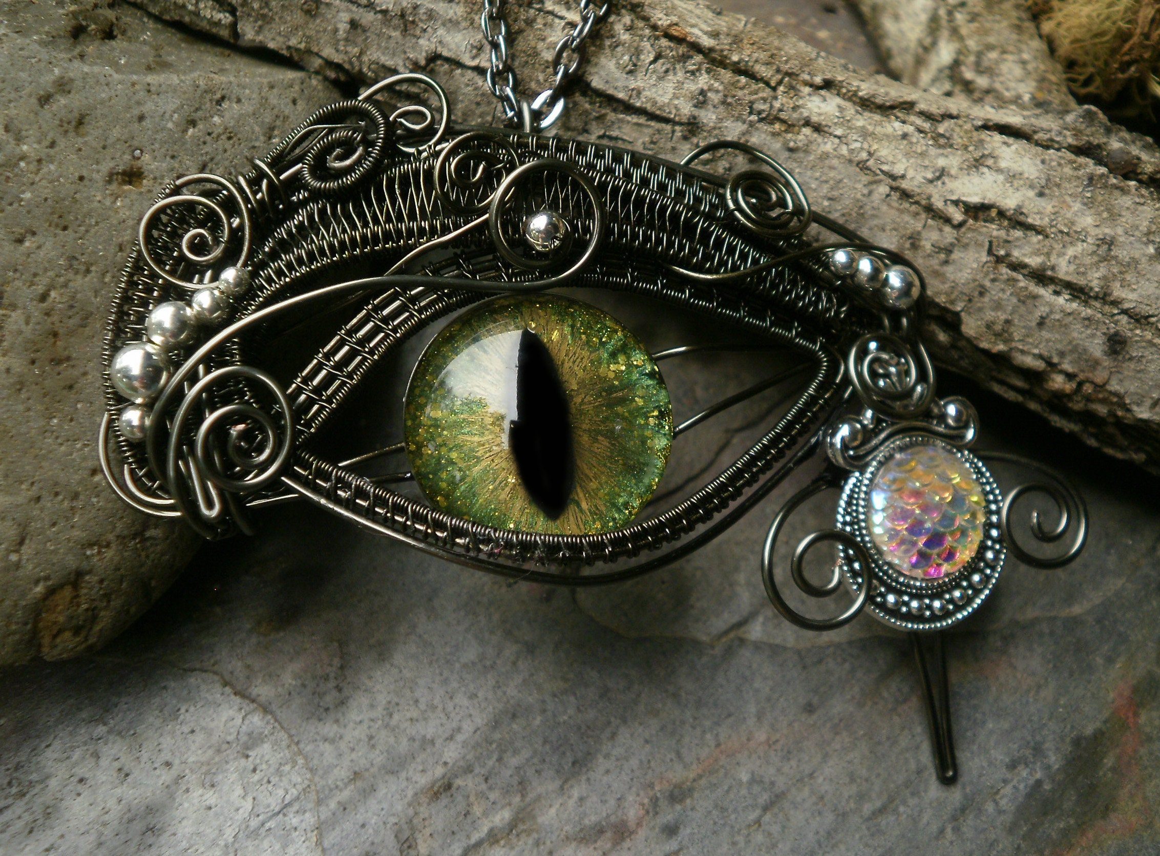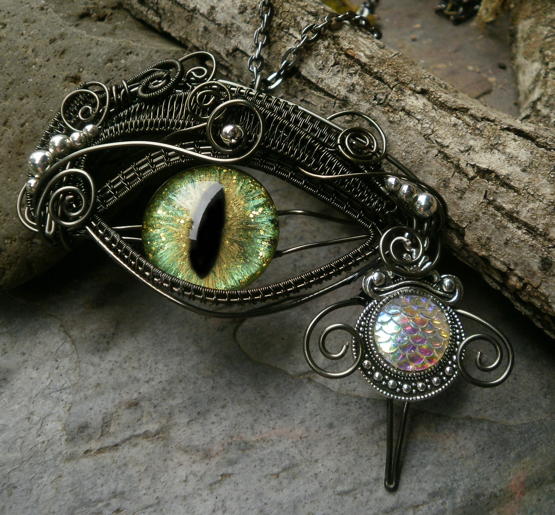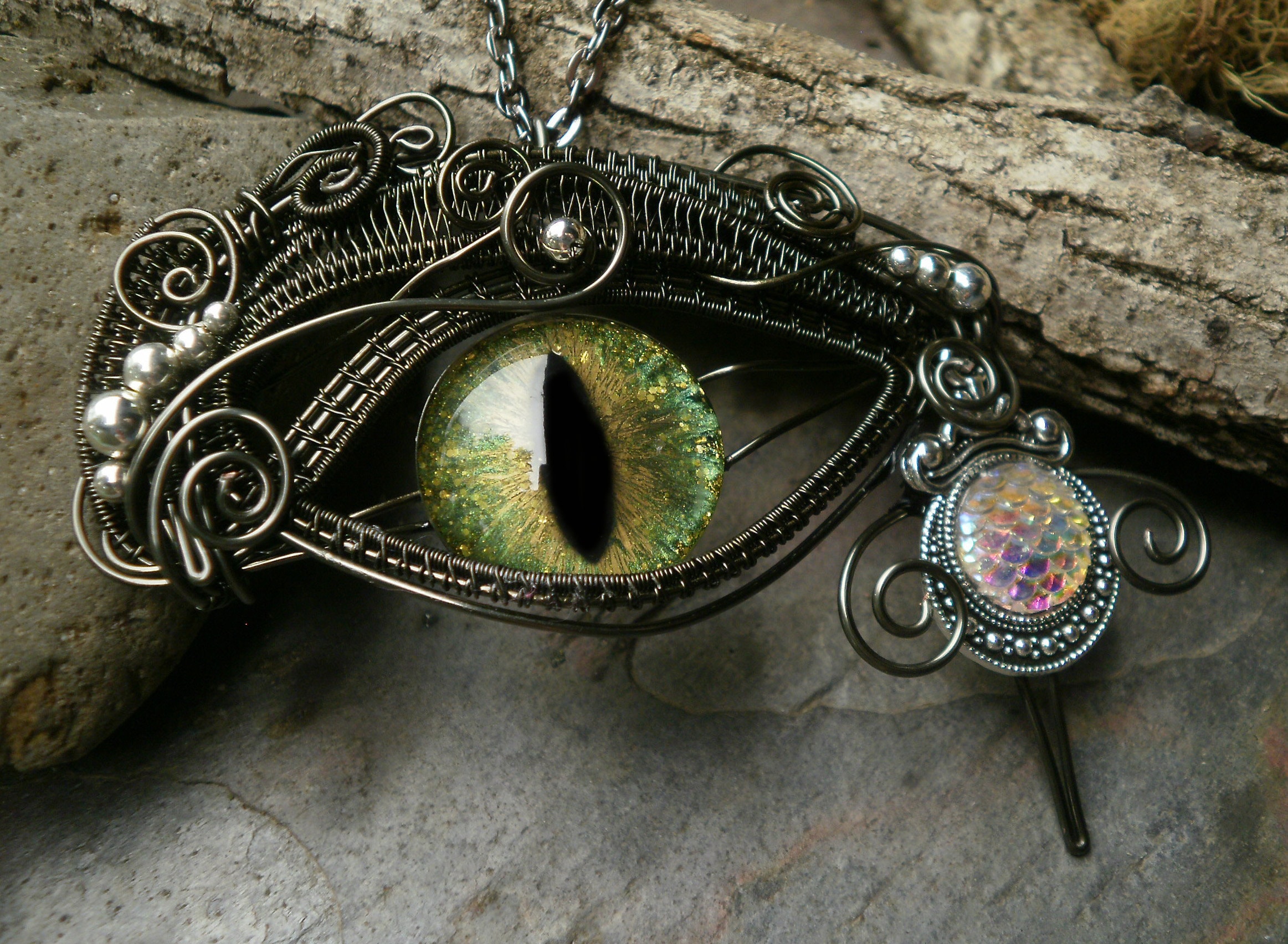 New Dragon Scale accents. They came assorted colors, so watch as they come to life. This one, the white iridescent color, goes along perfectly with the bright green eye. Handwoven wires are embellished with silver plated beads. A very pretty piece, at 3 1/4 inches in width, and suspended on a 24 inch chain. This can be converted into a pin/pendant, just ask and I'll set it up that way.